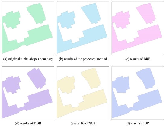 Zoom-in comparison of the regularization methods applied to ALS point clouds in the red box region of Figure 10. (a), original alpha-shapes boundary; (b–f), results of the proposed method, BRF [20], DOB [47], SCS [31], and DP [27] respectively.