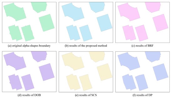 The original alpha-shapes boundary of the 2D footprints from Area-4 and Area-5, together with the corresponding generalized polygons produced by the proposed method are shown in Figure 10 and Figure 11, respectively. Detailed areas of the two environments are presented in Figure 12 and Figure 13, respectively. Overall, all of the five methods are capable of generalizing building footprints while maintaining the main structure. Long edges are simplified with good data fidelity due to the preferable sampling of the original ALS data. However, the results of the detailed reconstructions of the short edges are different. Shorter edges, which are not as densely sampled as longer ones, are neatly reconstructed in the polygons produced by the proposed method, BRF, and DOB, but are distorted or deformed in the polygons produced by SCS and DP. For rectangular footprints, the output polygons for the Manhattan-based method are concise and regular. However, some tilt edges are not regularized, see Figure 12 and Figure 13. As for the proposed method, nearly all the major structure of original boundaries are well preserved. Potential regularity between edges are discovered to enhance regularity, and non-dominant orientations are preserved to a large degree.