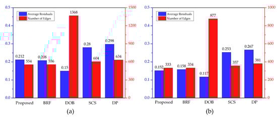Average data fitting residuals and numbers of edges of the output polygons of the photogrammetric dataset, (a) for Area-4 and (b) for Area-5. From left to right are the values for the proposed method, BRF [20], DOB [47], SCS [31], and DP [27], respectively.