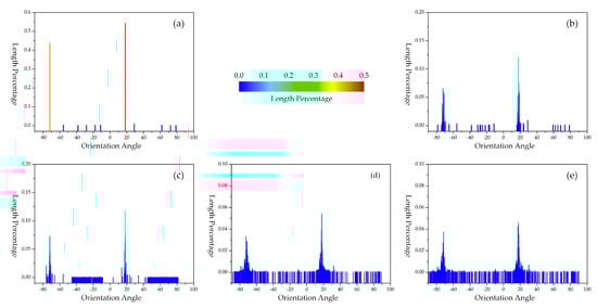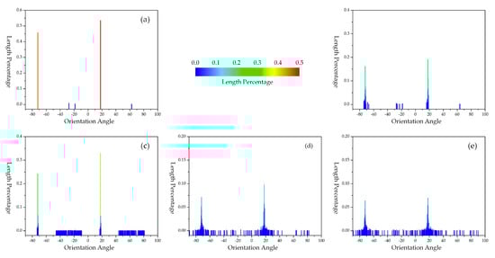 Comparison of the orientation angles that appear in the polygons output by different methods applied to the ALS datasets in Area-4. In each sub-graph, the dots and the corresponding drop lines mark the appearance of a certain orientation angle in horizontal plane. From (a–e) are the plots for the proposed method, BRF [20], DOB [47], SCS [31], and DP [27], respectively.