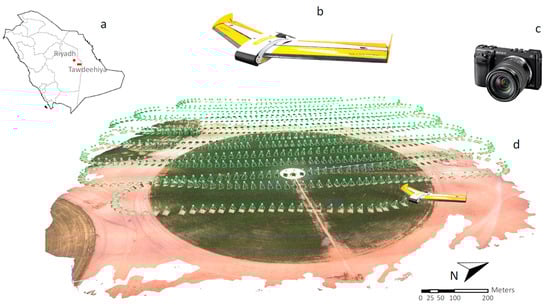 UAV platform and associated flight path utilized for surveying the maize pivot: (a) location of the Tawdeehiya commercial farm in Saudi Arabia; (b) the Quest UAV and (c) the Sony mirrorless NEX-7 with 24 Mpx sensor deployed onboard of the UAV system; (d) the flight path and camera location of where images were collected.