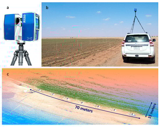The average point spacing was set at 1.2 cm at 10 m distance. For all the LiDAR surveys, a network of seven wooden stakes was deployed around the perimeter of each scan grid (seven for each campaign) and their location was recorded using the RTK-GPS system. These measurements were then employed for point cloud registration in the FARO SCENE (Version 5.3) proprietary software package for georeferencing, which joins together the multiple scans into a unique cluster, for a total of about 70 m in length (Figure 3c). The area of the scans within the perimeter of the GCPs was extracted and processed further using code written in-house. The scanned grids were georeferenced and the 4 April terrain model (LiDAR bare soil) was subtracted from the DSM to determine the crop height for each scan grid.