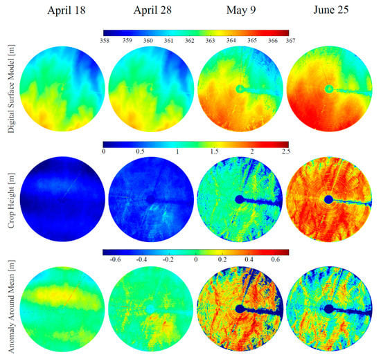 On 18 April, there are two banded regions in the upper- and lower-middle areas of the field that show positive anomalies above the mean (see bottom row of Figure 4), that do not seem to be maintained in the subsequent campaigns. It should be noted that the crop height retrieved on this date is likely affected by a higher level of uncertainty compared to those in later UAV flights, as the thin structure of the vegetation at the early stage (emergence) is not well captured by the generated point cloud. As reported by Grenzdörffer et al. [], errors are strongly related to the stage of crop growth. That is, crop height is better determined by the UAV-SfM system if the canopy surface is dense and homogeneous. In early development stages, crop height is more challenging to retrieve as the vegetation cover is lower and the individual stalks are small and do not normally form a closed canopy.