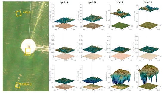 To highlight the ability of the SfM to retrieve fine structural changes in crop height, three sub-areas of 30 m × 30 m were extracted from within the field and presented in Figure 5. A healthy crop (Area 1), a static no-crop region (Area 2) and a problematic area (Area 3), were retrieved throughout the growing season, with changes in crop coverage and plant height depicted over the sampling dates. Perspectives from Areas 1 and 3 illustrate that the crop canopies were adequately reproduced by the point clouds, with crop growth well captured across the different stages. Visual interpretation of the images in Figure 5 reflects the spatial agreement between the derived crop height and the underlying orthomosaic, confirming the efficiency and accuracy of the UAV-SfM approach. As can be seen, Area 1 depicts a relatively stable canopy coverage for all dates, especially when compared with Area 3, which shows the impacts of soil or irrigation-related problems on the canopy structure. Further examination indicates that Area 1 and 3 follow the same growth trend up until 28 April, after which the crop development and subsequent canopy response diverge. For instance, by 9 May, Area 3 shows a loss in canopy structure, with half of the area of the 3D model and underlying orthomosaic reflecting the low canopy structure (although this is partly recovered by the time of the last retrieval on 25 June). Area 1 on the other hand, manifests a more linearly increasing crop height trend and is absent of any significant canopy alterations throughout the season. As expected, Area 2 remains consistent throughout the UAV collection period, reproducing the static bare soil section in the center of the pivot.