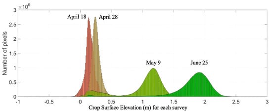 The dynamic crop height across the entire field was also visualized by considering the histograms of all pixel-based elevations for each of the individual UAV campaigns. The histograms were constructed by placing each z-coordinate of the crop surface models in a bin-size of 1 cm, providing an accurate representation of the distribution and frequency of the crop height estimates. As can be seen from Figure 6, the time-evolution of plant height is apparent across the growing season. The early stage distribution from 18 and 28 April, presents a sharp peak and narrow Gaussian distribution, reflecting the low crop height (25–50 cm) characteristic of the maize field at the beginning of the growth cycle. In the case of these low canopy retrievals, it can be observed that the distribution depicts some negative values in the field for the April 18 campaign, suggesting some inconsistency in the results. As stated before, negative values of crop height were obtained because ground values in the first campaign had higher elevation compared to those created on 18 April, thereby leading to negative height in the derived crop surface model. For this particular date, the crop coverage within the field is still low and the captured bare soil is almost the same as the previous campaign (4 April). However, any error in the UAV GPS coordinates, even though these have been corrected through the introduction of GCPs, still presents as a source of uncertainty, ultimately producing lower crop height estimates relative to the first survey (4 April). The plant height corresponding to the last two UAV surveys (9 May and 25 June) shows the highest intra-field variability, reflected by lower peaks and a wider range of the distribution: from 0 to 1.6 m and from 0 cm to 2.35 m, for the respective campaigns. Despite the similarity in the distribution of the last two UAV campaigns, 9 May shows a bimodal distribution that is not present on 25 June. This is explained by the presence of areas with low vegetation and with heights less than 50 cm, which represent 11.3% of the values in the distribution. On the other hand, 77% of the field has a height above 0.992 cm, which represents the average crop height. This intra-field variability, clearly depicted in the histogram, is also emphasized in calculations of the 25th and 75th percentile, whose values are 0.914 cm and 1.30 cm, respectively.