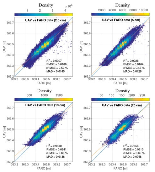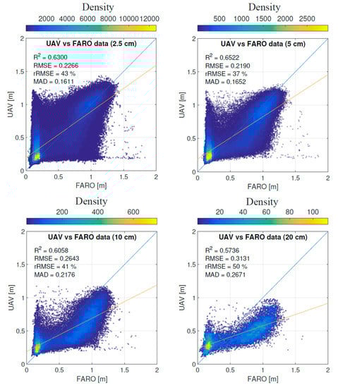 Density scatter plots illustrating the ability of the UAV and the LiDAR systems in reproducing the digital terrain model at 2.5, 5, 10 and 20 cm resolution (from top left to bottom right). The ground comparison is referred to the first UAV campaign on 4 April, where a 50 by 15 m area was selected as a sample for assessing the accuracy of the UAV-SfM system.