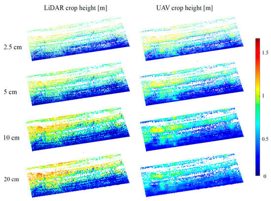 50 by 15 m crop height maps generated from both LiDAR (left column) and UAV (right column) systems, with clear identification of intra-field variability. Resolution of 2.5, 5, 10 and 20 cm have been assessed (from top row to bottom row).