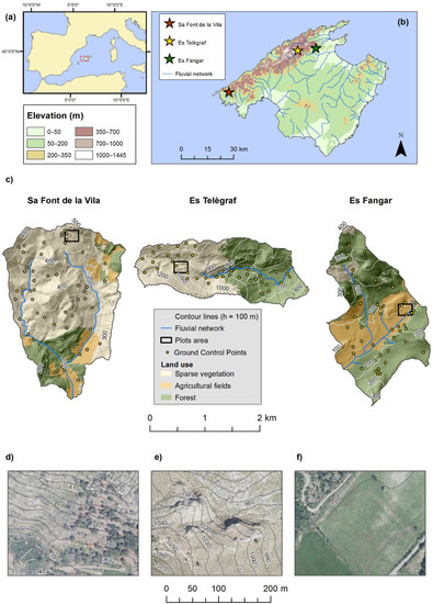 (a) Location of Mallorca within the Western Mediterranean Sea. (b) Location of the three contrasting catchments (Island of Mallorca). (c) Detail of Sa Font de la Vila, Es Telègraf, and Es Fangar catchments illustrating the main land uses (following CORINE 2012), contour lines (height interval h = 100 m; numbers indicate minimum and maximum elevation in metres above sea level), and first-order streams (from the 5-m LiDAR DTM). (d–f) Images of the analysed representative plots at each catchment (d = Sa Font de la Fila, e = Es Telègraf, f = Es Fangar). LiDAR: light detection and ranging; DTM: digital terrain model.