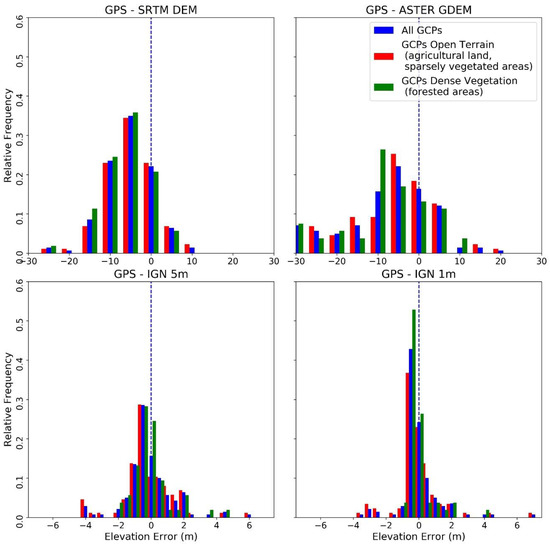 Relative frequency distribution of elevation errors (i.e., RTK-GPS minus DTM elevations) binned to 5 m (for ASTER and SRTM data) and 0.5 m (for IGN 5-m and 1-m data) intervals. Blue bars indicate the distribution of all ground control points (GCPs, n = 140), whereas the red bars account for GCPs considered as open-terrain (agricultural landscapes and sparsely vegetated terrain, n = 87) and the green bars for densely vegetated GCPs (forest cover, n = 53). RTK-GPS: Real Time Kinematic Global Positioning System.
