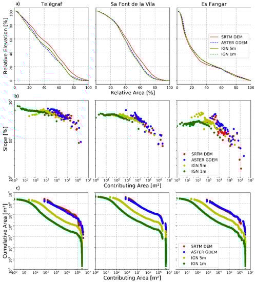 (a) Hypsometric curves, (b) slope–area relationships, and (c) cumulative area distributions derived from DTMs.