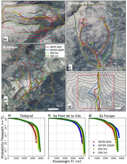 At the mountainous Es Telègraf catchment, SRTM produced straight-line stream features that did not reflect the actual terrain topography (Figure 4a). Furthermore, the satellite-derived SRTM and ASTER models indicated the existence of second-order streams that were not represented by the IGN LiDAR data for this catchment. It should be noted that Es Telègraf was also the catchment with the largest differences in delimited catchment area between the datasets (Table 2), where the SRTM and ASTER models largely failed to determine the actual boundary of the catchment, particularly in the southernmost contributing area region. In contrast, a better consistency between the models was obtained for the terraced Sa Font de la Vila catchment, despite some important shifts in the position of second-order streams at the headwaters and at the outlet point being detected (Figure 4a). The small area of interest represented in Figure 4a illustrates for this catchment how the streams derived from the IGN LiDAR data (green and yellow lines for the 5-m and 1-m IGN models, respectively) tended to reproduce the natural flow patterns of the landscape, following the valley floor as indicated by the 10-m contour lines, while the SRTM and ASTER streams (red and blue lines, respectively) partly deviated from those pathways. In the mixed Es Fangar catchment, the position of the outlet was identical for all DTMs, but again, remarkable differences were observed in the second-order streams, with the ASTER model showing the largest deviations (Figure 4a). Complementarily, the empirical inverse cumulative distribution function of flowlength probability (flowpath length iCDF; Figure 4b) revealed important differences among the datasets for Es Telègraf (i.e., shorter extreme flowpath lengths for the SRTM data) and Es Fangar (i.e., longer extreme flowpath lengths for the ASTER data).