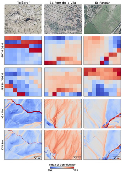 The coarser spatial resolution of the satellite-derived SRTM and ASTER models (~27 m) strongly limited the applicability of the analysed index of water/sediment connectivity (IC) for revealing small-detail surface flow patterns in the studied landscapes (Figure 5). Differently, the IC showed reliable surface flow patterns for the study sites using the LiDAR-based IGN DTMs, although the 1-m data considerably improved the details provided by the 5-m data (Figure 5). In accordance with these general results, a variety of differences characterised the IC performance of the SRTM, ASTER, and IGN LiDAR data for the small-detail 5-ha study plots. For example, for the mountainous Es Telègraf catchment, both the SRTM and LiDAR datasets showed a highly connected NW–SE flowpath that was enforced by the presence of a massive outcrop in the study site, while this dominant surface flow pathway was absent in the ASTER-derived IC map (Figure 5). The IC representation for this plot of the SRTM model was, however, limited as the high connectivity area appeared blurred and not as sharp as in the LiDAR-based IGN data. In Sa Font de la Vila, where the 5-ha small-detail plot was centred on a terraced hillslope, the SRTM and ASTER models failed to represent the effects caused by the presence of bench terraces on the surface flow patterns (Figure 5). The dendritic-like, highly connected network represented along the N–S direction by the IGN-derived maps of IC for this terraced site was replaced by a nearly uniform IC area in the SRTM and ASTER data. Furthermore, the effects of terracing on the IC patterns of this plot were better established by the 1-m data than the coarser 5-m LiDAR-based IGN model. Last, the IC results obtained in the 5-ha plot of Es Fangar again highlighted the severe difficulties of the ASTER model to reveal actual water and sediment pathways that are controlled by small-detail landscape objects. In this site, the small-detail plot was located in an agricultural field delimited by a road and a parallel artificial channel running along the SE corner of the landscape (Figure 5). Both the SRTM- and LiDAR-based IGN data showed a highly connected pathway running from NE to SW at the eastern border of the plot, reproducing the natural direction of the flow. Contrarily, the ASTER-derived IC values were highest along the northern part of the plot and did not show any sort of linear features associated to the actual water and sediment pathways of the landscape. Further comparisons of the SRTM- and LiDAR-derived IC patterns for this plot revealed that SRTM could not resolve minor features of the agricultural field (i.e., preferential flow patterns), indicating high connectivity crossing the plot from N to S. It should be also noted that even for the high-resolution 1-m LiDAR dataset, the position of the highest IC values did not exactly reproduce the actual position of the artificial channel in the landscape.