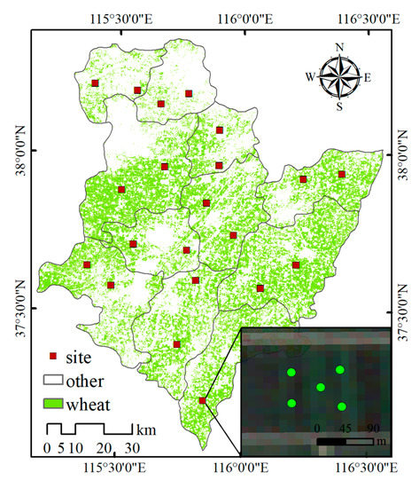 Field experiments were conducted in 2017, at an agricultural region in Hengshui City (115°10′–116°34′E, 37°03′–38°23′N) of Hebei Province, China. The region is part of the Huang-Huai-Hai Plain of China, which is an alluvial plain of the Yellow River, Huaihe River, and Haihe River [35]. In this region, winter wheat is the primary crop, and the main crop planting pattern is rotation of winter wheat and summer maize [36,37]. For winter wheat, the developmental period occurs from early October to early June of the next year. Field data measurement was conducted on the winter wheat with a single genotype during the three key phenological phases: Jointing stage (12 April), heading stage (5 May), and grain-filling stage (31 May) of winter wheat. The relatively homogeneous fields with a size larger than 1 km2 were selected. A total of 21 fields were examined. In each field, five plots were deployed diagonally with a distance longer than 50 m to each other as shown in Figure 1. Besides, all points are further than 50 m from the edge of the field. Thus, 105 plots were selected for all experiments (hyperspectral measurement in three phenological phases and final yield estimation in the harvest time). In addition, a Global Positioning System (GPS, Trimble GeoExplorer 6000 Series GeoXH, Trimble Navigation, Ltd., Sunnyvale, CA, USA) was used to record the coordinates so that the same corresponding positions could be accurately located at different growth stages.