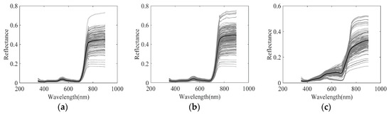 In the entire range of 350 nm–2500 nm, the spectral information in the visible and NIR-infrared regions was highly correlated with the important crop growth parameters and main physiological activities of plants, which were all related to the final yield accumulation. Moreover, the spectral information in this band could also be acquired by most UAV hyperspectral platforms, which provides a possibility of future application in winter wheat yield prediction at a regional scale. Thus, the spectral information in the range of 350 nm–900 nm was used for analysis. Figure 2 shows the original hyperspectral reflectance of all samples with gray color and the averaged hyperspectral reflectance with black color of the winter wheat canopy at the three physiological phenophases.