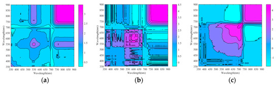 Contour map of synchronous traditional 2D correlation spectra at 350 nm–900 nm: (a) Jointing stage, (b) heading stage, and (c) grain-filling stage.