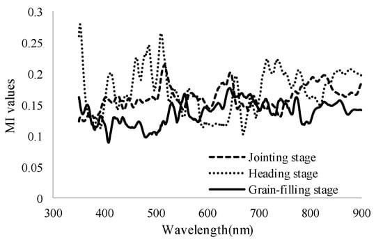 Considering the limitation of the traditional 2D correlation spectral method, this research calculated MI values between the canopy spectral information at the three phenophases and the yield data, respectively (shown in Figure 4), and introduced it to the conducted MI-enhanced 2D correlation spectral analysis to directly acquire the sensitive wavelengths representing the final yield in three phenological phases.