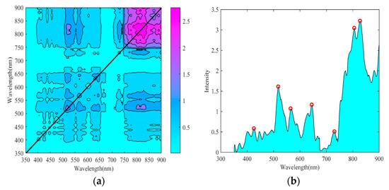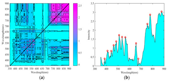 Figure 6a,b show the synchronous 2D correlation spectra and the principal diagonal graph during the heading period. The figures for this period have more details compared with those for the jointing stage. Thirteen featured wavelengths (385 nm, 410 nm, 442 nm, 463 nm, 485 nm, 510 nm, 536 nm, 564 nm, 657 nm, 677 nm, 755 nm, 779 nm, and 878 nm) were sensitive to the variance in yield interference and were selected for this period.