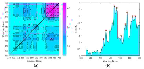 - Peaks’ selection criteria. The peaks on the principal diagonal in the enhanced synchronous correlation spectrum represented the susceptibility of vibrations of the certain functional group with increasing yield. The wavelengths of some specific peaks can be selected as the sensitive wavebands. In order to make the best of the characteristics of the crop spectral information and further decrease the redundancy of the selected wavelengths, the criteria of peaks’ selection on the diagonal of the MI-enhanced 2D correlation spectrum is set as below: The selected peaks should have a prominence of at least , and the distance between the selected peaks should be larger than . A and B could be calculated through Equations (7) and (8):where is the reflectance in the range from 350 nm to the end, is the reflectance at the red-edge position, and is the reflectance in the range from 350 nm to the reflectance valley in the red region.