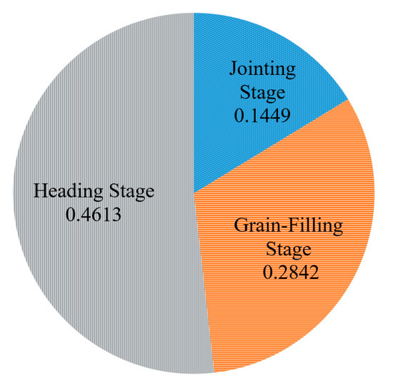 The comprehensive analysis of the results of the feature selection using the enhanced 2D correlation spectrum indicated that the photosynthesis intensity increased from the jointing stage to the heading period with increasing photosynthetic pigment contents and canopy structure. The photosynthesis intensity decreased during the grain-filling period because the leaves turned yellow gradually. Except for the physiological activities related to photosynthesis, nutrient transport during the grain-filling period became more pronounced than that during the two other stages. After Equation (9), the quantitative contribution ratios of the different periods to the final yield of winter wheat were determined, which are shown in Figure 8.