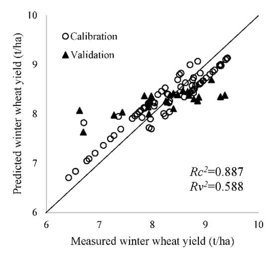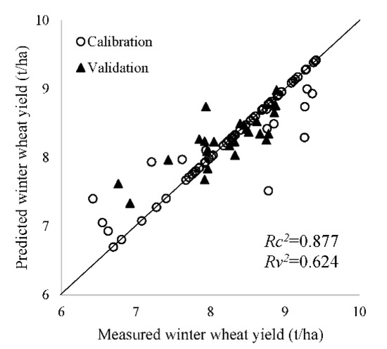 - Three groups of comprehensive weighted characteristic spectral information for the different periods were obtained combining the selected wavelengths and contribution ratios. Such information was used as the input data to establish the SVM prediction model. The calibration R2 of the model reached 0.877, and RMSEC was 0.27 t/ha; the validation R2 reached 0.624, and RMSEP was 0.353 t/ha. The model performed well in yield prediction with satisfactory accuracy and robustness. Its performance verified the effectiveness of the selected wavelengths and indicated that the winter wheat yield could be predicted using the plant canopy spectral information at different periods.