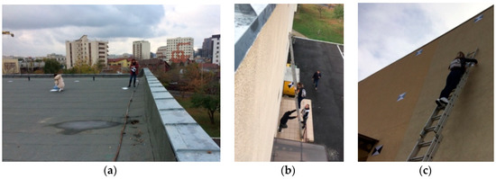Marking the ground control points (a) on the building roof, (b) and (c) on the facade.