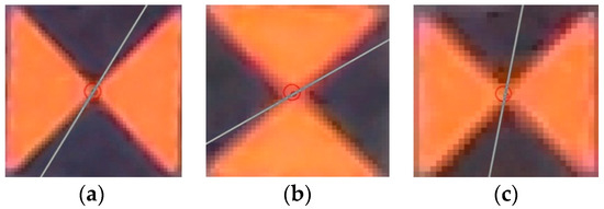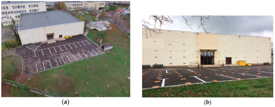 During the flight, the points marked on the façade and the roof were marked with A3 laminated sheets (Figure 1a–c); after having drawn two black and white triangles, their intersection represented the mathematical point.