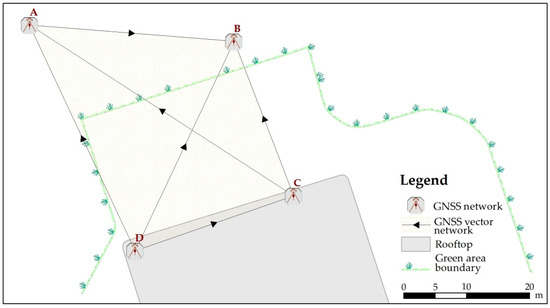 The spatial geodetic network was designed with 4 points (A, B, C, D), two of which (A, B) were grounded in the green area behind the Faculty of Hydrotechnical Engineering, Geodesy, and Environmental Engineering; the other two (C, D) were located on the rooftop, in the northern part of the building at a height difference of about 9 m (Figure 3). In the foregoing research, a local reference and coordinate system was adopted.