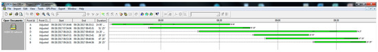 The duration of an observation session is determined by the length of the polygon sides, the number of visible satellites, the geometry of their space position (as assessed by PDOP—Position Dilution of Precision) and the accuracy requirements imposed when determining the network points. Due to distances of less than 50 m between the network points, the duration of a work session was at least 20 min, ranging from 26 min to 1 h and 50 min, i.e., the time period required to resolve ambiguities from phase measurements. After data collection, the receivers were switched off and a part of them were moved as in the measurements scheme on the following bases (A–B–D, A–D–C, D–C–B). The measurements continued afterward (Figure 4).
