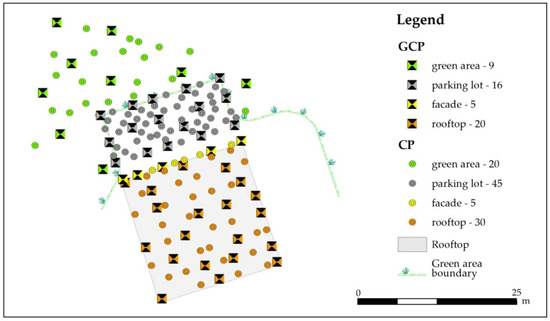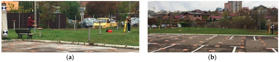 Firstly, 349 uniformly distributed points in the study area were marked: 104 points on the roof (marked with paint, using a plastic pattern), 55 points distributed on 11 rows on the building façade being marked using a construction black marker, 29 points in the green space (reinforced concrete poles to ensure different heights having a metal bold in the superior part), 2 points from the GNSS network (concrete), and 159 points in the parking lot (metallic bolts) (Figure 1).