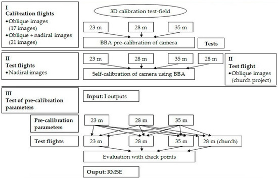 Our study assessed the accuracy of image block orientation through BBA process with a focus on the influence of pre-calibrated camera. For this purpose, the calibration parameters for the digital camera integrated into the “DJI Phantom 3 Standard” UAS platform calculated using the proposed test-field calibration and the “3DF Zephyr Pro” software for three different heights, namely 23 m, 28 m, and 35 m, and for two image configurations only with oblique images and with a combination of nadiral and oblique images, have been tested.