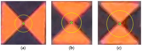 Screen shots with a control point image in Pix 4D Mapper (No. 229) positioned approximatively in the calibration field center (a) 23 m height, (b) 28 m and (c) 35 m height.