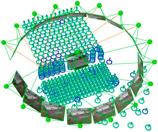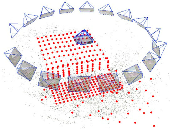 As an advanced processing option, the geometrically verified matching was utilized for the matching strategy, and the “standard” option was selected with all internal and external parameters optimization for the calibration method. After performing the BBA, the images have been oriented and the rest of the 340 GCPs were measured easily on each image as they appeared, the approximate position being indicated by the software after performing a ray intersection (Figure 8). Even so, the GCP marking remains time-consuming for the operator (approximately 8 h).