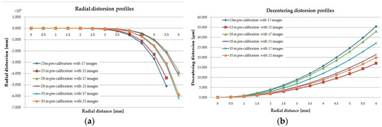 (a) Radial and (b) decentering distortion profiles for the digital camera mounted on “DJI Phantom 3 standard” UAS at 23, 28, and 35 m height for 17 oblique images and 21 oblique and nadiral images.