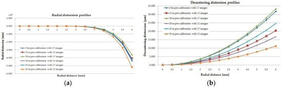 To model the radial distortion Δr, the odd-order polynomial Δr = K1r3 + K2r5 + K3r7 [26,27,28], where r is the radial distance, was used and the radial distortion profiles for all three heights, and for the two image configuration, as shown in Figure 10.