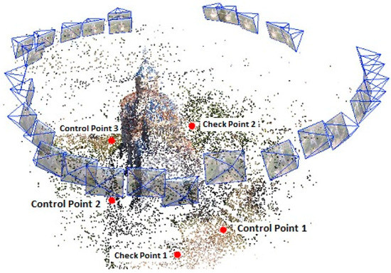 In order to test the pre-calibration parameters on an oblique flight, we chose a UAS reconstruction project done for an old monastery two years before camera calibration. Five reference points were uniformly distributed around the monastery, allowing good visibility without any blockage from vegetation. Three of them have been used as GCPs in order to place the project into a desired coordinate system, i.e., “Stereographical on unique secant plane 1970” and two of them as check points (Figure 17).