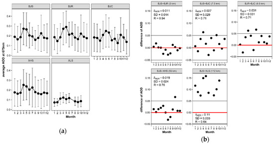 Overview of the monthly statistics of AOD at 675 nm (AOD675) at five AERONET stations. (a) The monthly averaged AOD675 (vertical lines indicate the standard deviations), and (b) the difference in AOD675 between two sites. The defined as .