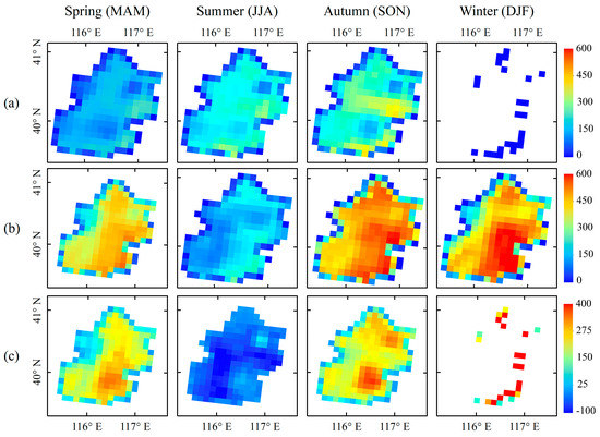 Figure 8 shows the NE seasonal differences (defined as C6.1_NE–C6_NE) of MOD04/MYD04 C6 and C6.1 over Beijing. As shown in Figure 8a,b, in both MOD04 and MYD04, the NE of the DT product was reduced in most seasons/regions, especially in areas of water, where the NE of the C6.1 DT was at least 15 days less than that of the C6 DT product. This is because the C6.1 DT algorithm degrades the quality of retrievals to zero if there are more than 20% of the water pixels in the retrieval box (20 × 20 pixels). Unlike DT, the NE of the DB product (DB_NE) significantly increased over Beijing in all seasons. The MOD04/MYD04 DB_NE increased by more than 60 days from January 2001 to December 2016 and from July 2002 to December 2016, respectively, over vegetated areas during autumn and winter. Therefore, the MxD04 C6.1 DB product can provide more complete time-series AOD information than other products, such as MxD04 C6 DB/DT and C6.1 DT, over Beijing where the land cover is dominated by mixed urban surfaces.