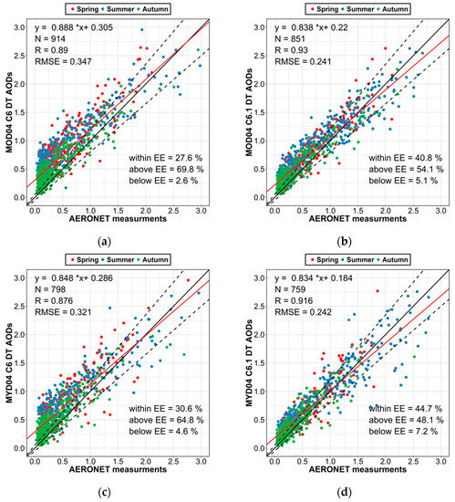 Figure 9 shows scatter plots of the AODs derived from MxD04 C6 and C6.1 DT against the AODs obtained from ground-based sun photometer measurements at the Beijing site in spring, summer, and autumn. In Figure 9, the satellite retrievals and ground measurements exhibited good consistency, with R = 0.876–0.930 and RMSE = 0.241–0.347. However, the MxD04 C6 DT AODs were overestimated due to underestimation of the surface reflectance and the use of inappropriate aerosol optical properties in the LUT: The PWE was only 27.6% and 30.6% for Terra and Aqua, respectively, and these retrievals were largely overestimated, as PAE = 69.8% and 64.8%. As shown in Figure 9b,d, the modifications in the DT algorithm enabled a better agreement between the C6.1 and AERONET AODs than that of the C6, with a higher R and a smaller RMSE. The PWE increased by 40.8% and 44.7% for Terra and Aqua, respectively, which is approximately 13% higher than that for C6 DT. The overestimation was greatly reduced with a low PAE (Terra: 54.1%, Aqua: 48.4%), which was approximately 15% lower than that for C6 DT. For the MOD04/MYD04 C6 and C6.1 DT products, the values of PBE are 2.6/4.6% and 5.1/7.2%, respectively, meaning that the two products showed negligible underestimation over the urban surfaces of Beijing.
