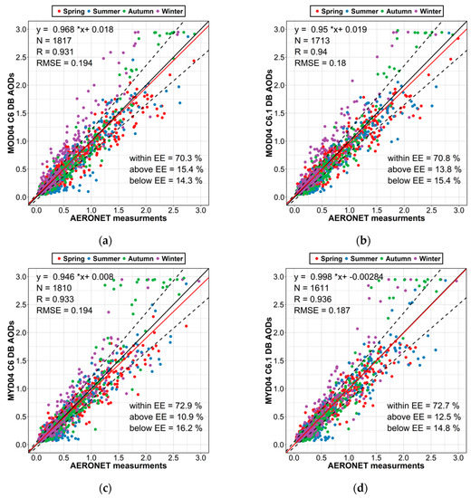 Comparison of the retrieval accuracy between the MOD04/MYD04 C6 DB and C6.1 DB AOD products in the four seasons.