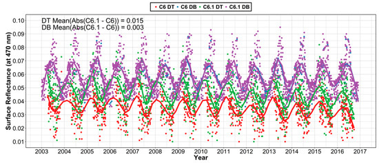 As described in the Section 2.2, over land, the DT and DB algorithms use different methods to estimate surface reflectance, which determines the retrieval accuracy for the most part. Thus, there is no doubt that the accuracy of surface reflectance estimation is most crucial for AOD retrieval, and it also explains the accuracy difference between two different algorithms. Here, we compared the temporal trends and seasonal variations in the surface reflectance, which was used in the MOD04 C6/C6.1 DT and DB products from 2003 to 2016. These surface reflectance values were obtained from the “Surface_Reflectance_Land” SDS for DT products and the “Deep_Blue_Spectral_Surface_Reflectance_Land” SDS for DB products. As shown in Figure 11, the time series of surface reflectance in the C6 and C6.1 DB products were very similar with a very small difference value (0.003). The surface reflectance in the C6 and C6.1 DT products also had a similar temporal variation trend, but the surface reflectance of C6.1 was significantly higher than that of C6, due to the improvements in the C6.1 DT algorithm due to the modification of the surface reflectance scheme over urban surfaces [8]. Figure 9 shows that C6 DT had a larger uncertainty than C6 in the AOD retrievals, implying that errors were induced by assuming inappropriate surface reflectance. The overestimation of DT AOD retrievals over Beijing is due to underestimation of the surface reflectance in the visible channels. Although the C6.1 DT algorithm improved the estimation of surface reflectance, there is still a serious overestimation issue over Beijing.