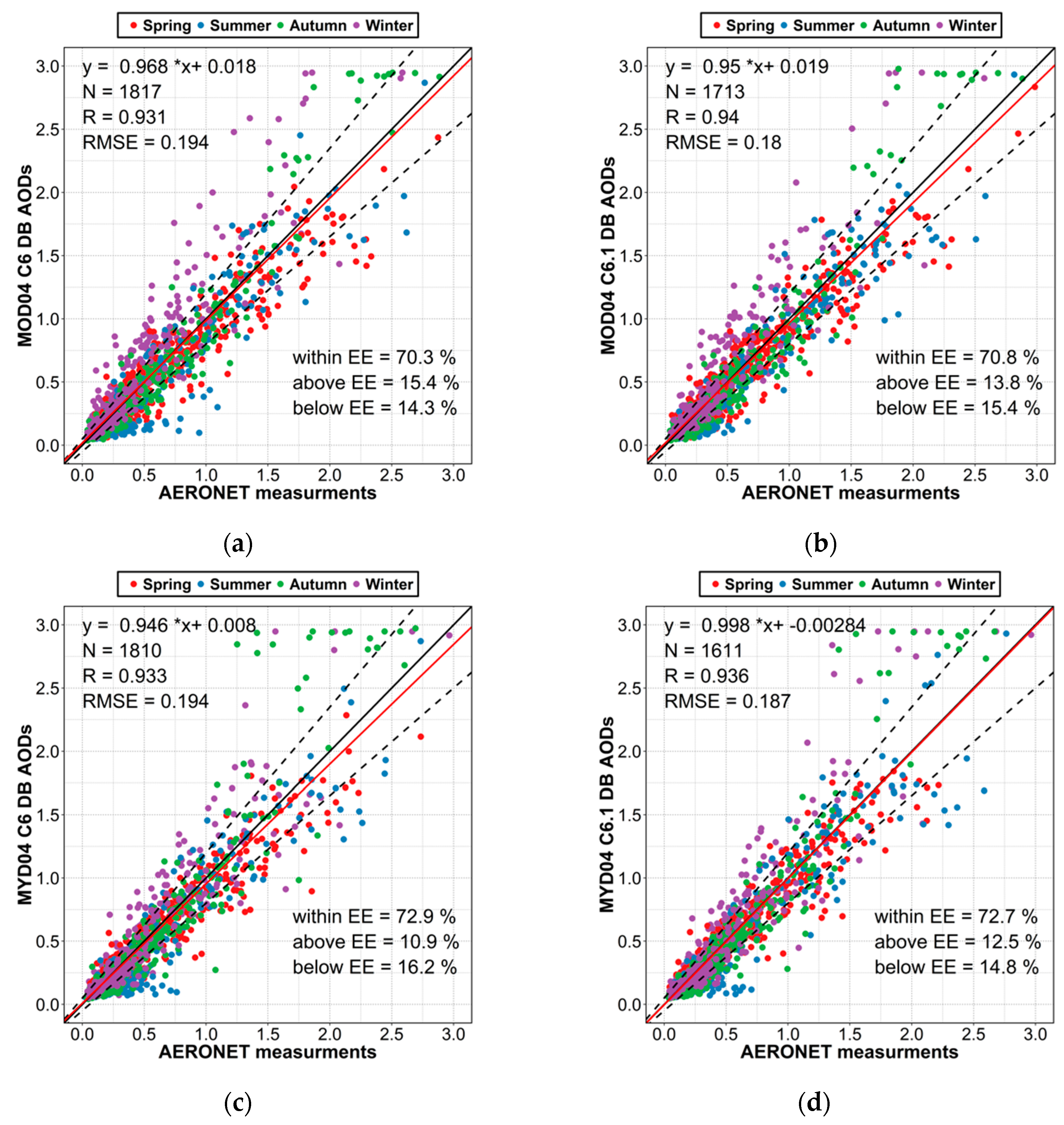 3.4. Validation of the C6 and C6.1 DB AOD Products