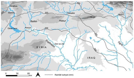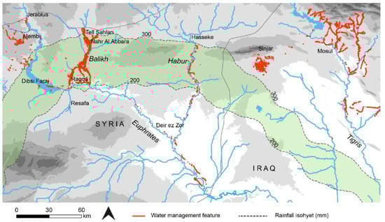 Ancient water management features/systems throughout northern Mesopotamia [1,2,8,11,15,16,50,51]. Although the zone represented by the 200–300 mm isohyets technically could support rain-fed agriculture, precipitation was highly variable.