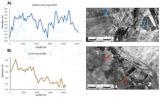 Long profile graphs using SRTM elevation and CORONA images. Hollow ways (A) did not need to conform to the gradient of the landscape, while canals (B) flowed clearly downhill.