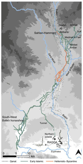 The empires and states that followed (e.g., the Hellenistic, Roman, Umayyad, and Abbasid states) were also able to control large areas of the Northern Mesopotamian landscape, supporting their economies with agriculture and trade. Well-dated water management features of this period are known, including a canal in the Balikh [9] and rock-cut water conduits in the Jerablus area [2,10]. Throughout the time of the later empires (from ca. 2nd millennium BC), and especially by the Early Islamic period (ca. 8th century AD), water management technology was widespread [1,2,11], including alongside the difficult-to-control Euphrates [12,13,14] as well as intensive cultivation in tributaries such as the Balikh and the Habur [1,11,15,16]. Increased uptake of water management technology at this time may have been related to specific Early Islamic policies of bringing more land into cultivation [17] (pp. 181–182).