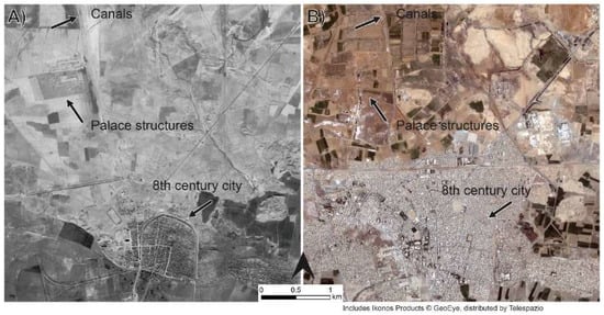Unfortunately, recent conflict continues to limit access to Syria and Iraq, and warfare-related damage to archaeology has been high-profile. In addition, ongoing intensification of modern agriculture and urbanisation have had a severe impact on the landscape and its archaeology. This has particularly affected ancient irrigation systems, which are usually collocated with modern agriculture. The construction of new irrigation systems and fields since the 1970s has caused older layouts to be levelled. Large areas of land have been inundated by modern dams, which removed some historic large canals that flowed alongside the Euphrates near Tell Fray and Dibsi Faraj (see References [1,2]). The historical bird’s-eye view offered by declassified cold war (1960s–1970s) satellite imagery enabled the layout and function of these complex hydraulic features to be interpreted. Contextualising this mapped evidence with the archaeological and historical evidence for dating and function allows the political and economic implications of past water management to be understood.