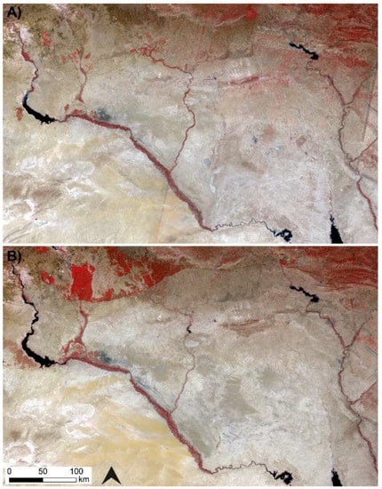False colour Landsat composites showing the intensification of agriculture in Northern Mesopotamia over the past 40 years. (A) Landsat 5 composite, 1985–1986; (B) Landsat 8 composite, 2016–2017. Images downloaded and mosaicked using Google Earth Engine.