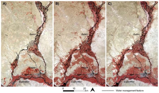 The Landsat sequence shows the intensification of agriculture underway from the 1980s (Figure 12 and Figure 13). In Syria, this was part of a programme involving construction of the Tabqa dam in 1966, 30 km upstream of Raqqa [61]. Figure 13 highlights the Balikh, where we identified many ancient canal networks that corresponded neatly to the areas of modern irrigated agriculture highlighted by using a false colour visualisation. By the 21st century, modern agriculture had expanded throughout the valley, including new fields and irrigation networks in the south, the area known as the “horseshoe”, where several ancient canals supplied Early Islamic palaces and urban areas around Raqqa. Recent disruption to irrigation infrastructure has been reported in the region due to the current conflict in Syria [19,65], which is demonstrated by a slight reduction in the vegetated area between the 2010–2011 and 2016–2017 Landsat composites.