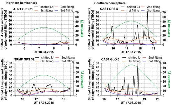 Figure 1 depicts the performance of the algorithm, including three-step fitting, for an time series from the northern and southern hemispheres (left and right column, respectively). The first panel (station ALRT, satellite GPS 31) depicts the situation with signatures of patches observed for low-elevated data. In this case, the structures are properly extracted from the time series, although the orientation of the GNSS signal was poor. On the other hand, it should be remarked that STEC enhancement for almost horizontal direction may significantly differ from the vertical one due to the long path of the signal in the ionosphere.