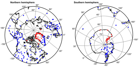 Distributions of GNSS permanent stations in both hemispheres (as seen from geomagnetic poles). Stations that were located over 75° of altitude-adjusted corrected geomagnetic (AACGM) latitude were depicted with red dots.