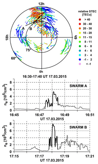 The noteworthy findings are provided by the comparison of patch detection with ground-based GNSS and SWARM data. Looking at Figure 4, one can observe that the results for both methods are only partially compliant. For some periods—such as 16:00–20:00 UT as presented in Figure 4a or 10:00–12:00 UT as given in Figure 4f—there is a good coincidence, but this is not always the case. The main reasons for discrepancies are the orientation of SWARM orbits and the sounding of different areas of the polar ionosphere by both techniques. In order to depict both of these effects, we selected two representative examples. The first of them, which is given in Figure 5, is related to the sequence of three patches (~60–90 TECu in a slant direction) that occurred in the southern hemisphere during the main phase of the storm (16:30–17:40 UT on 17 March). The top panel of Figure 5 presents the relative STEC values as a function of MLT and AACGM latitude, with the latter extended to 60° and traces of two arcs of SWARM satellites. The bottom one provides the temporal variations of foreground plasma density for the SWARM series. Analyzing these results, it should be remarked that the auroral oval for this period was extended to 60° [46]. As is shown, both techniques allow the identification of extreme structures, and the results are compatible. In the case of LEO satellites, the detection occurs at 70–73° of AACGM latitude, i.e., below the latitudinal limit as applied for automatic detection equal to 77° [6]. Thus, these structures were not classified as patches in such a mode of processing. Certainly, it does not reduce the effectiveness of the SWARM results, but rather highlights that the monitoring of the polar ionosphere for the particular passage of an LEO satellite depends on its orbit orientation and the area that was adopted for patch detection. In contrast to this, the distribution of GNSS measurements was in this case highly favorable, as it resulted in a clear depiction of high-density plasma on the dayside ionosphere. Figure 5 confirmed that the usefulness of ground-based GNSS data at the southern hemisphere is mostly restricted to polar cap area.
